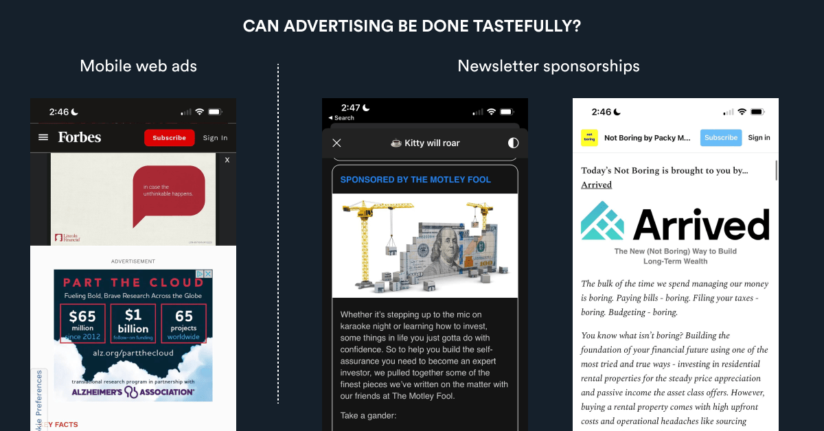 Not Boring has 140K readers and makes money from sponsorships despite being on Substack, a platform that’s focused on subscriptions.