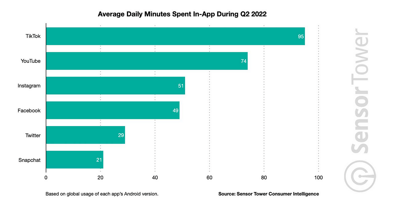 During Q2 2022, the average TikTok user spent 95 minutes (!) in the app each day. That level of engagement is stunning, close to double that of Instagram and quintuple that of Snap. (It’s worth noting that I have one friend who averages 14 hours a day on TikTok. And no, I don’t know how that’s even possible.)