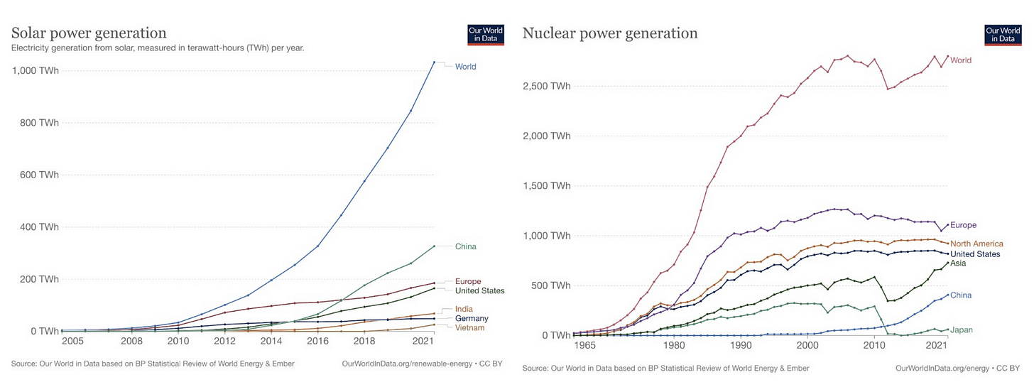 Climate isn’t just a new vertical for investment and business creation, but a horizontal through-line cutting across every industry. Two charts from Damir’s dinner also showed how China is outpacing the rest of the world in solar and nuclear.