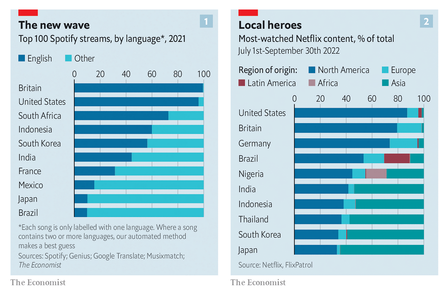 Last month, The Economist broke down how pop culture has gone global. In short, the English-speaking West used to dominate global culture, but that’s changing. Squid Game (Korean) is the most-watched show on Netflix; Khaby Lame (Senegalese-Italian) is the most-followed person on TikTok; Bad Bunny (Puerto Rican) is the most-streamed artist on Spotify. An excerpt from the piece:
