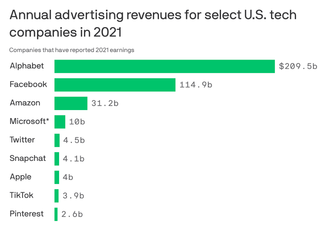 Most estimates have direct response comprising about 80% of all digital ad dollars spent online. Facebook, Instagram, Snap, YouTube, and now TikTok have followed a predictable migration from brand to direct response. YouTube’s rapid revenue growth in the past few years is partly related to its shift to direct response, which still only makes up an estimated 20-30% of its revenue. TikTok, for its part, is currently making a huge effort to build out direct response. Twitter, unfortunately, never quite figured out direct response, which is a key reason its share price is up only +3% since IPO compared to Facebook’s Meta’s +300% gain.