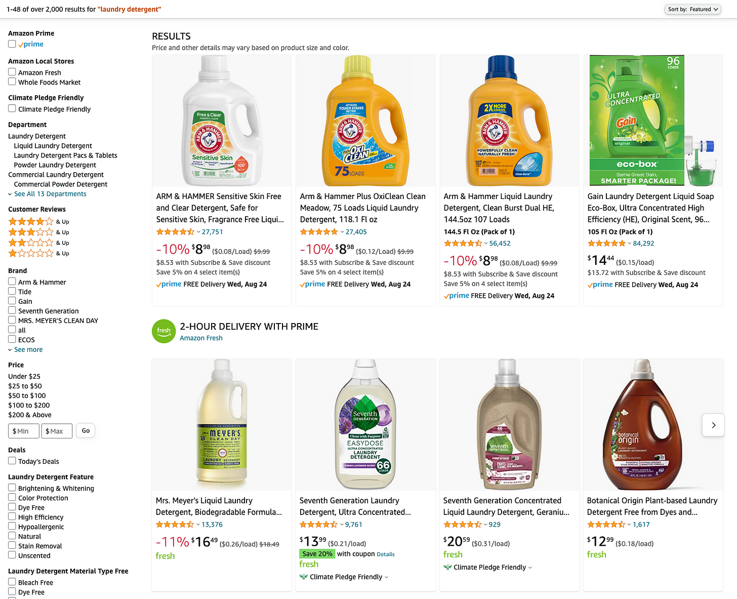 Although Tide dominates the U.S. laundry detergent market (41% market share, more than the next five brands combined), when I search “laundry detergent” on Amazon I don’t see Tide anywhere: