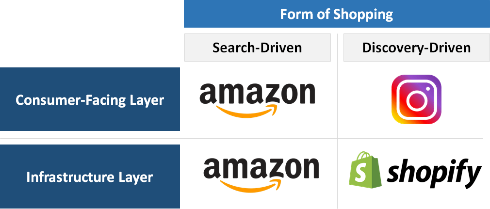 But discovery-driven shopping is more difficult online. Amazon, for one, is terrible at it. Rather, social platforms have become the nuclei of discovery commerce, with Shopify providing the plumbing underneath. In one of my first Digital Native pieces over two years ago, I made this chart to illustrate the two forms of shopping: