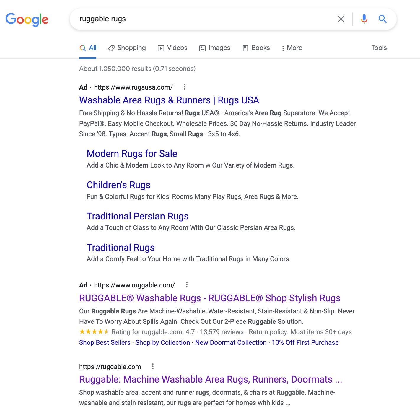I’ve been doing a lot of furniture shopping lately for my new apartment. Here’s an example of direct response advertising: when I search Ruggable rugs, Google instead serves me a sponsored placement for Rugs USA, a direct competitor to Ruggable in the “washable rugs” category. The second result, also paid, is for Ruggable itself.