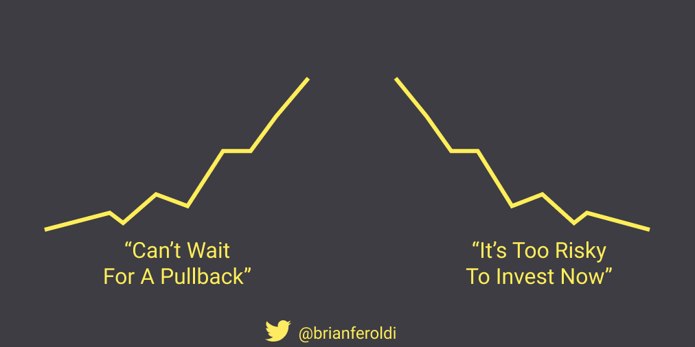 The left side is a bull market. The right side is a bear market. If your investor psychology is left unchecked you’ll likely think either of these two thoughts: 1) “Can’t wait for a pullback 2)It’s too risky to invest now.